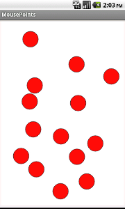 Below is a simple example of aWorldthat adds a new point at each mouse click. The world contains aSceneand a newCircleis placed for each"button-down"event received. The World is created in the class that extends Activity.import android.app.Activity; import android.os.Bundle; import android.view.Display; import android.image.*; import android.world.World; public class MousePoints extends Activity{ // Called when the activity is first created. public void onCreate(Bundle savedState) { super.onCreate(savedState); Display dis = getWindowManager().getDefaultDisplay(); // Create and start the World new MousePointsWorld(new EmptyScene(dis.getWidth(), dis.getHeight()-50)) .bigBang(this); } } class MousePointsWorld extends World{ Scene scene; MousePointsWorld(Scene scene){ this.scene = scene; } public Scene onDraw(){ return this.scene; } public World onMouse(int x, int y, String me){ if(!me.equals("button-down")){ return this; }else{ return new MousePointsWorld( this.scene.placeImage(new Circle(20, "solid", "red") .overlay(new Circle(20, "outline", "black")), x, y)); } } }After a few finger-taps, the device will look something like this: