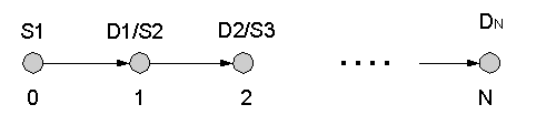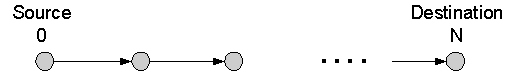 Set up a chain network with N nodes. The distance between two neighboring nodes is 100 meters. Node 0 is the source and Node N is the destination. The packets travel along the chain of intermediate nodes towards the destination (a multihop session).