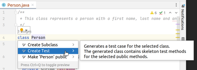 Hover or click on the name of the class. A yellow IntelliJ bulb will appear to give suggestions. Click on it and select Create Test.