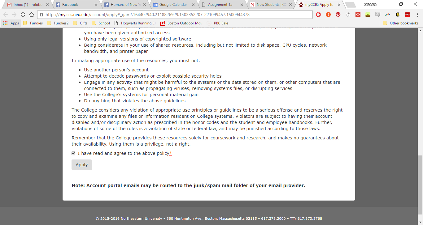 Go to https://my.khoury.northeastern.edu/account/apply to apply for a CCIS account. Provide your first name, last name, Northeastern email address (the one that ends in @northeastern.edu), and a username.