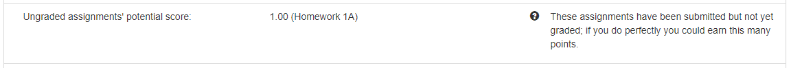 The homeworks not yet graded lists the points you could get on assignments you have submitted that have not yet been graded (or the grades have not yet been published). Right now homework 1A has not yet been graded and it is worth 1% of my grade so I have 1 point in this category.