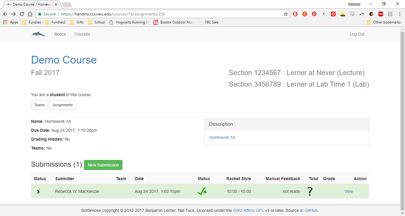 The homepage looks something like the image below. Notice that it gives you a list of the courses you are registered for in each semester as well as the list of assignments for those courses and how you did on them. On the right hand side you will see a “Teams” box which will give you information about any students you are currently partnered with. Right now I have no team so it says “No active teams”.