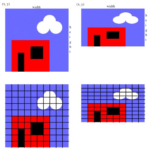 The picture is shown in different positions with different heights. It is also shown twice with a super-imposed grid so that you can tell where the cloud, house, door, and window are within the drawing. Your function should not draw the grid.