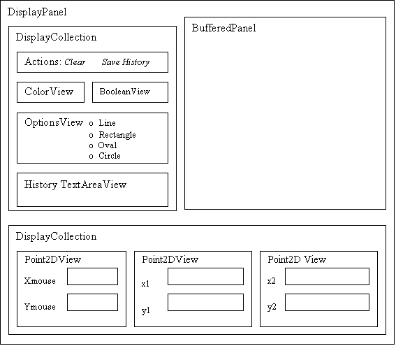 We start by identifying all the views that we will need to display the information user needs to see. Of course, there will be BufferedPanel for the graphics. There should be TextfieldViews to display the points that select the size and location of the shape to be drawn and the mouse position. There will be ColorView for choosing the color. We will need a place where to keep the history - this will be a TextAreaView. The choice of shape will be determined by selecting one button among four in an OptionsView. Finally, we will have theee actions: Clear and Save and NewFirstPoint. Later we will see how a pair of TextfieldViews can be used to build a single Point2DView.