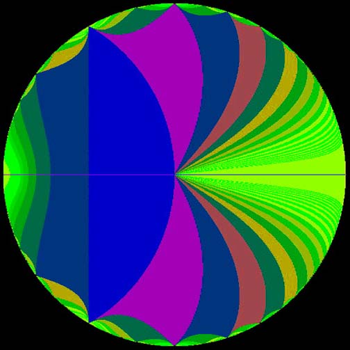 Given epsilon > 0, define the color of the complex number z to be the smallest positive integer n such that |(z - 1).im / (z - 1).re - (zn - 1).im / (zn - 1).re| < epsilon. That is, the slope of the line through z and 1 differs from the slope of the line through zn and 1 by less than epsilon. For this image, epsilon = 0.02 and the highest power of z considered is 24.
